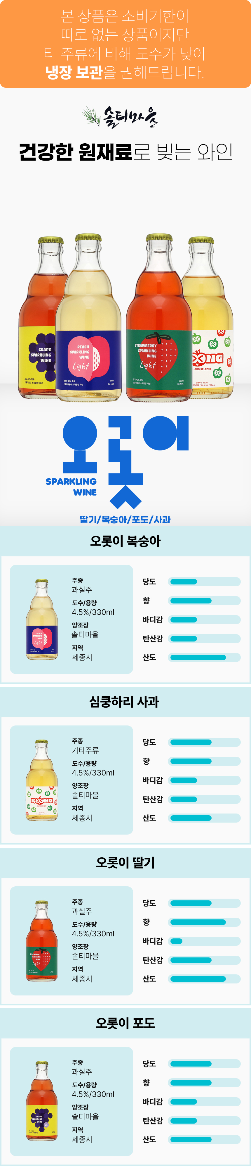 술마켓 무료배송 솔티마을 오롯이 스파클링와인세트 4.5도 330mlx4 복숭아,사과,딸기,포도